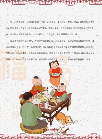 第三,適量運(yùn)動(dòng),運(yùn)動(dòng)的好處就不多說了,太多了,不過建議,中飯,晚飯,飯后可以適量散